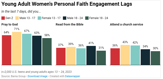 Bible Reading: Just 31 percent of young adult women note having read the Bible in the last week, compared to 37 to 41 percent across all other Gen Z groups (young women ages 13–17 and all Gen Z men).