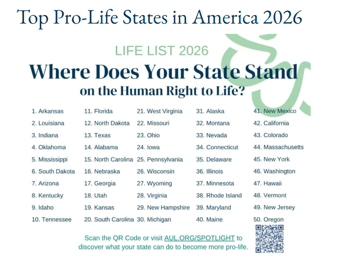 According to AUL, this Life List ranks states from most to least pro-life based on their existing life-affirming policies, looking at each state’s “protections for life from conception to natural death.”This includes “laws on abortion, legal recognition of preborn children, bioethics, assisted suicide and end-of-life patient care, and healthcare rights of conscience.”