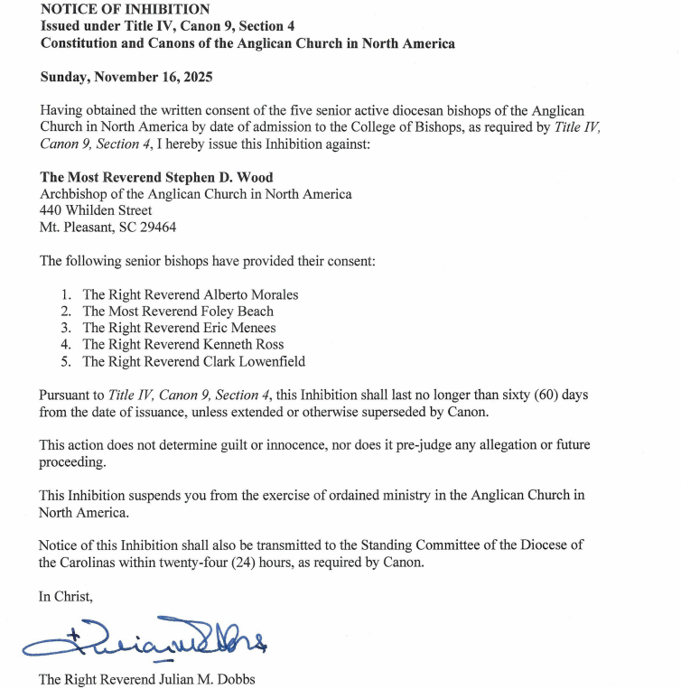 The Anglican Church in North America (ACNA) Archbishop Steven Wood has received a 60-day suspension from all ministry duties after more than 140 of his fellow clergy signed an open letter calling for his ‘inhibition’, and after senior active diocesan bishops signed off on it.