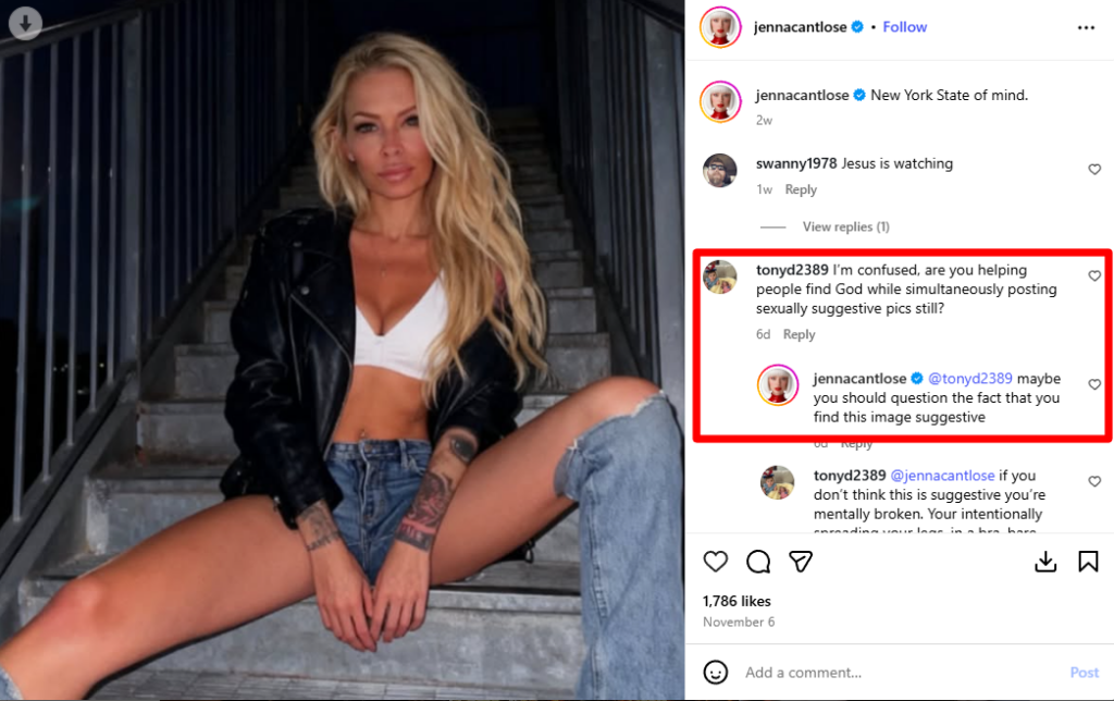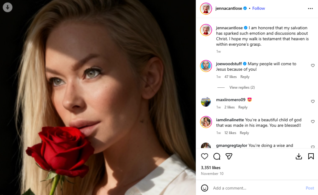 “Jenna is being loud and proud about her walk with Jesus Christ. She believes that boldly proclaiming her love for Him is helping open so many people’s eyes to the truth that no one is beyond redemption.”