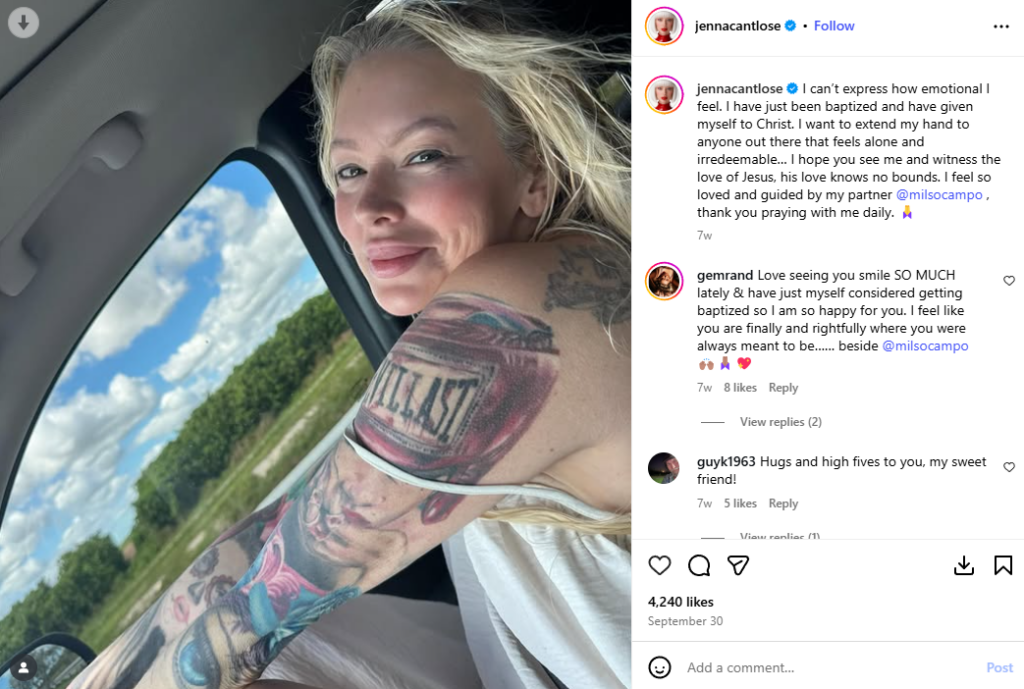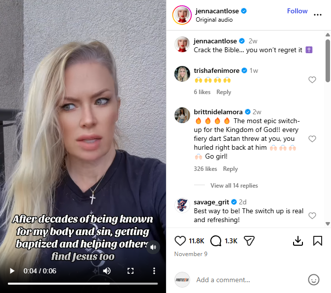 Former adult film star Jenna Jameson shared in an Instagram reel that “after decades of being known for my body and sin,” she has become a Christian, has been baptized, and is dedicating her life to “helping others find Jesus too.”