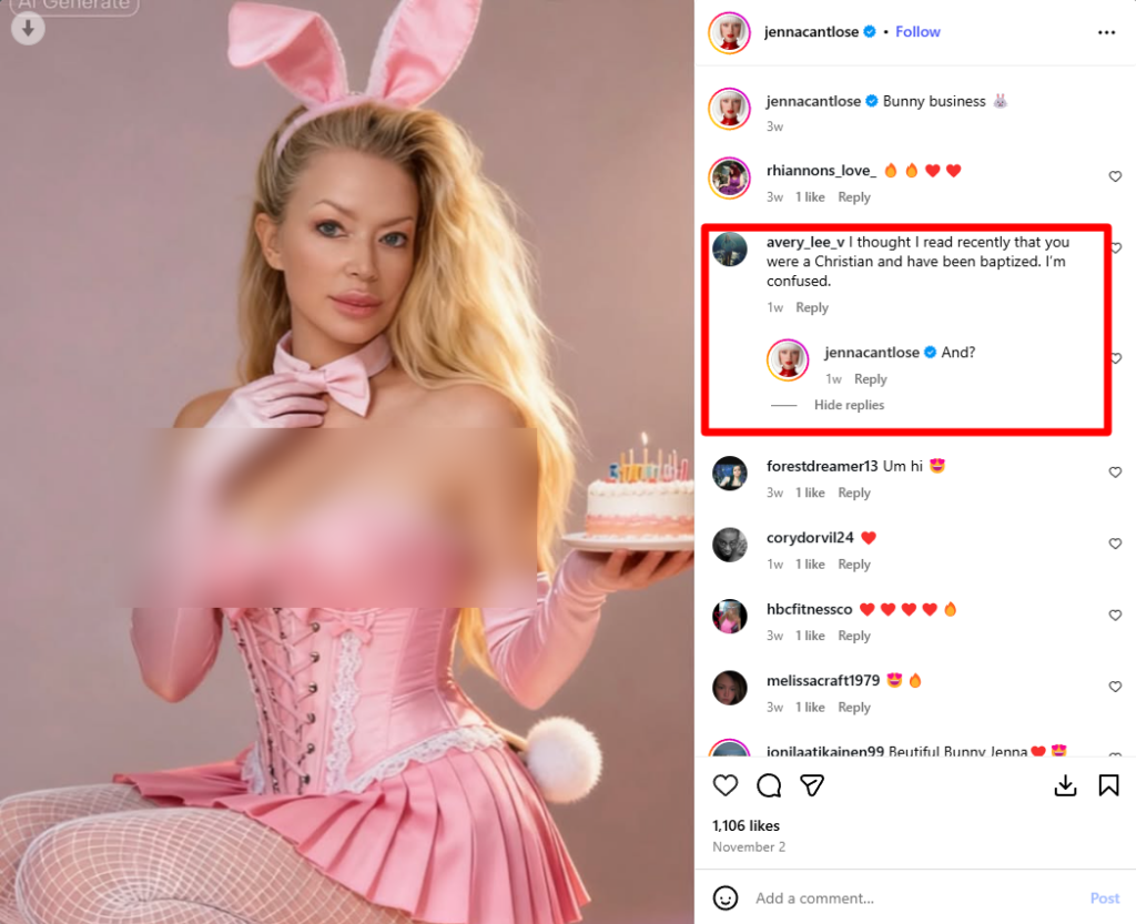 Instead, she keeps posting new sketchy images, sometimes paired with bible verses. Three weeks ago, she posted a photo of herself in a Playboy bunny outfit, challenging a commenter who criticized her for this in light of her professing faith. (Blurred by us)