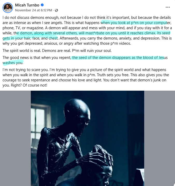 Embattled ‘prophet’ and seer Micah Turnbo has stepped back into the limelight and is quickly demonstrating he’s as spiritually unhinged as ever, including insisting the demons masturbate and ejaculate all over you every time you look at pornography.