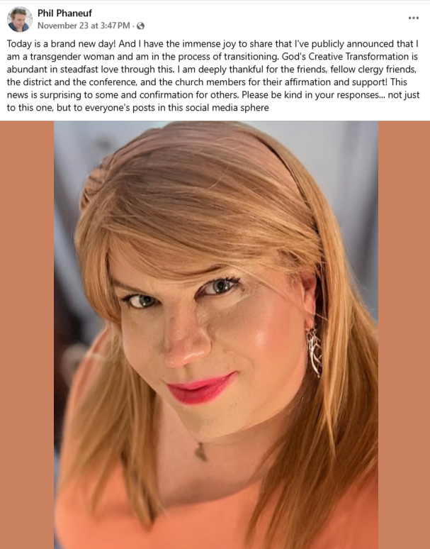 UMC pastor shocks his congregation by announcing during the sermon that he's transgender and will be 'transitioning' to a woman.