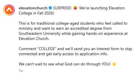 Elevation Church has announced that it will launch Elevation College in the fall of 2026.
