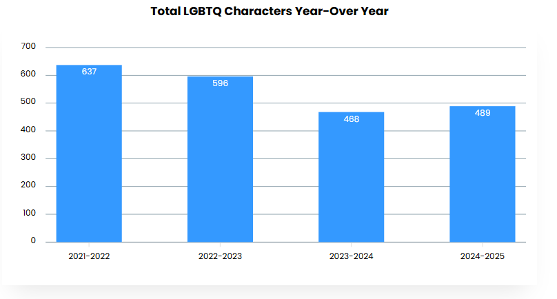 - Across primetime scripted broadcast, primetime scripted cable, and scripted streaming original series that premiered a new season between June 1, 2024 and May 31, 2025, GLAAD counted 489 LGBTQ characters in total. This is a 4% increase and 21 additional characters from 468 characters counted in the previous season.