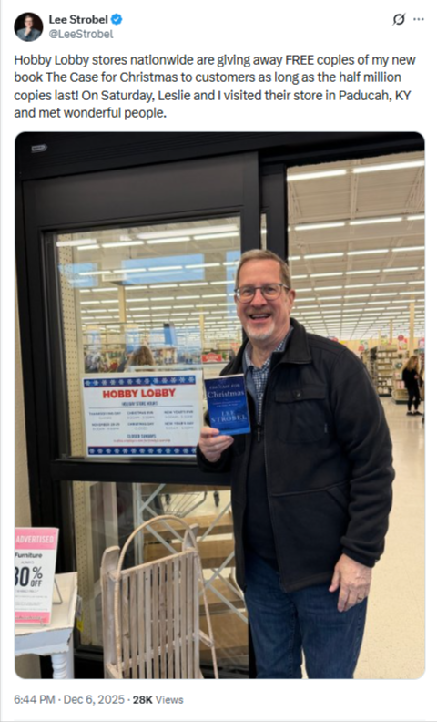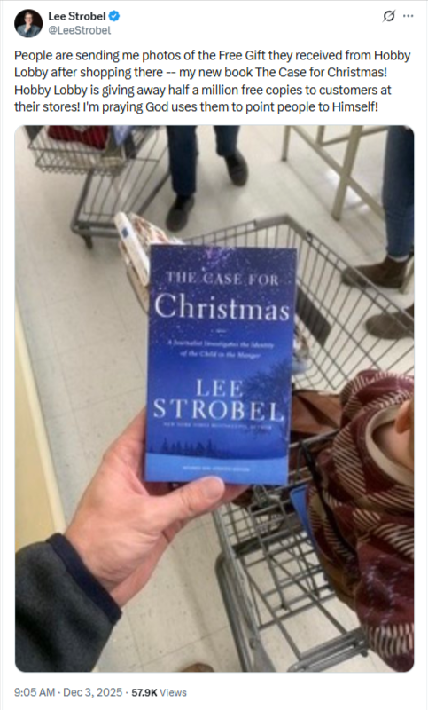 Retail giant Hobby Lobby, which is run by the devoutly Christian ‘Green family’, is giving away half a million free copies of Lee Strobel’s book The Case for Christmas in their stores this holiday season.