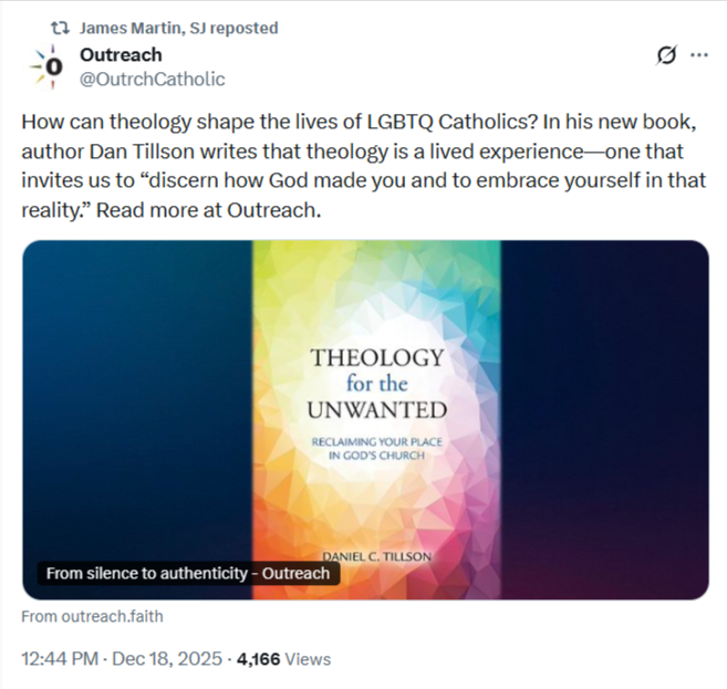 Martin reposted an endorsement from Outreach, the pro-LGBTQ organization he founded in 2022, that teaches homosexuality is good and holy, for the book Theology for the Unwanted: Reclaiming Your Place in the Church, written by Daniel C Tillson.
