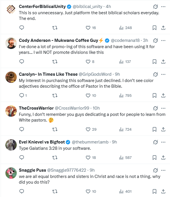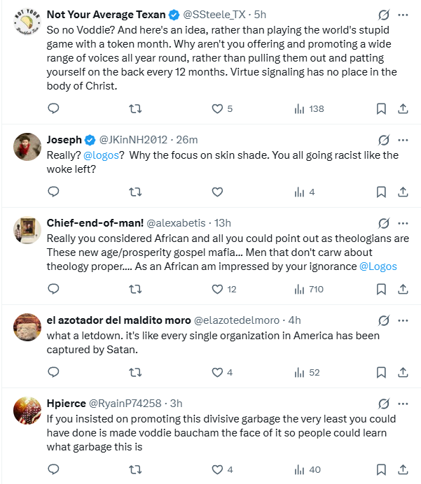 One commenter, Rebecca, argued “The color of skin should have no bearing on what solid Christian teaching is recommended. My work promotes Logos often to students, but Logos issues of late are causing us to think twice.” Another, Dustin, added “What does the amount of melanin in someone’s skin make them more to be listened to? This makes no sense. There’s time to delete this partiality”