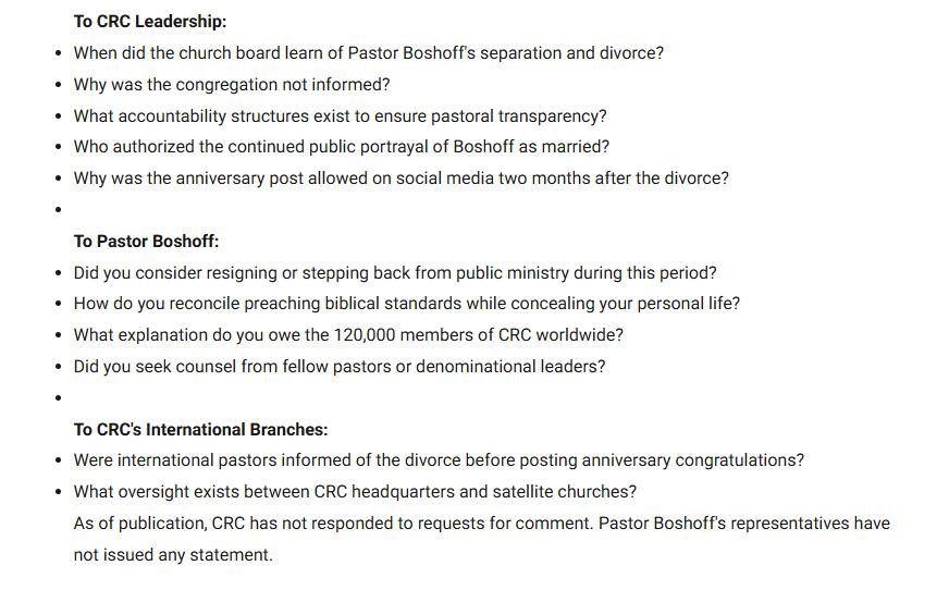 - Boshoff continued to preach from CRC’s pulpits as a married man