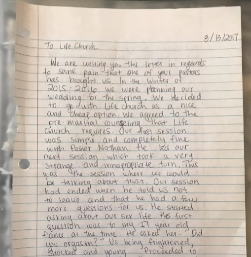 Another driving factor in the culture of discontent at Life Church is the revelations that have come to light about a closed-door pre-marital counseling session Peternel had with a pregnant 17-year-old girl named Paige.