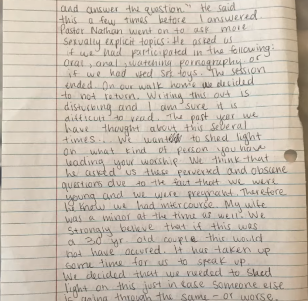 They did, however, write a letter to several people in church leadership complaining about the “perverted and obscene questions” and the way the session went. She also emailed the files to herself to leave a paper trail and confirm when they were sent.
