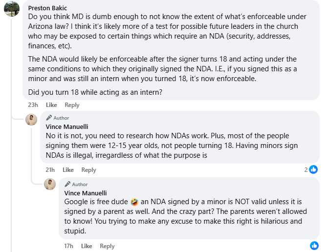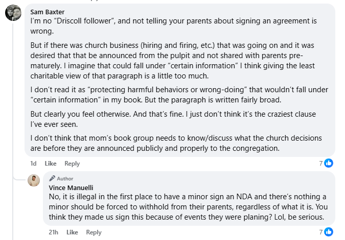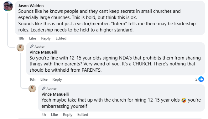 As part of the promo for his book, however, Manuele released what he purports to be a portion of an NDA that he signed, which, among other things, prohibits Jr. Interns who work at the church from discussing certain information with parents.