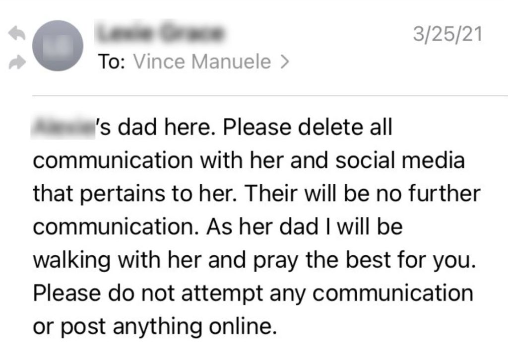 Vincent Manuele was 15 years old when he started attending Trinity Church in the summer of 2020 and became involved with the worship team. Before long, he and Driscoll’s 17-year-old daughter started spending more time together and developed feelings for each other.