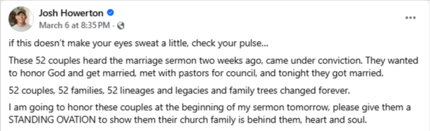 More than 50 unmarried, cohabiting couples got married in a joint ceremony at Lakepointe church last week, a 30,000- member multisite church led by @howertonjosh in Rockwell, TX.