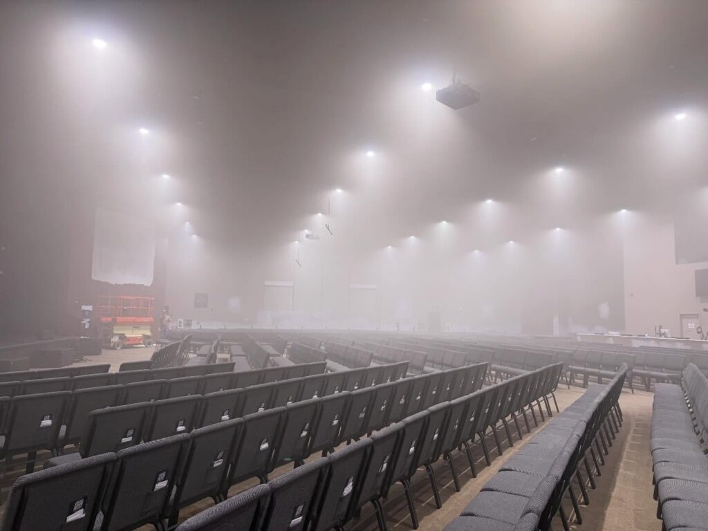 Firefighters brought in a Mobile Ventilation Unit, which is a large vehicle-mounted fan, to “help clear the haze and return the building to normal conditions.”