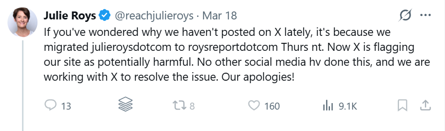 Our re-uploading of the public record footage was done in the public interest, as single sources of material hosted by third-party sites like YouTube are notoriously unreliable and subject to access being removed at the whim of the uploader. Even Roys’ own website recently experienced security issues, as an apparent redirect from julieroys.com to roysreport.com caused several DNS security systems to flag the site as a “known security threat,” with major social media traffic sources like X reportedly blocking links to her site.