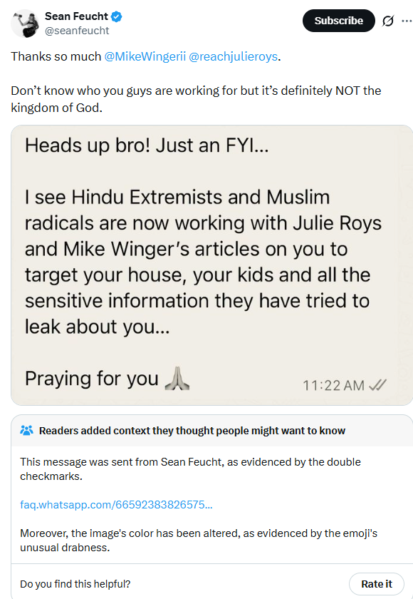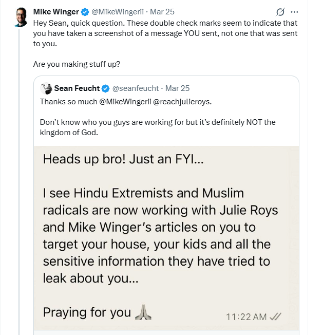 On X, Feucht tagged Christian apologist Mike Winger and journalist Julie Roys, accusing them of being complicit in his being targeted by Hindu extremists and Muslim radicals because of their criticism of him.