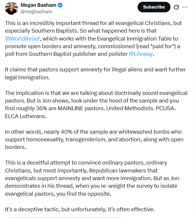 Start with who paid for it. World Relief — a member of the Evangelical Immigration Table, which has spent years lobbying evangelical institutions toward open-borders immigration policy — sponsored this survey and hired Lifeway to conduct it.