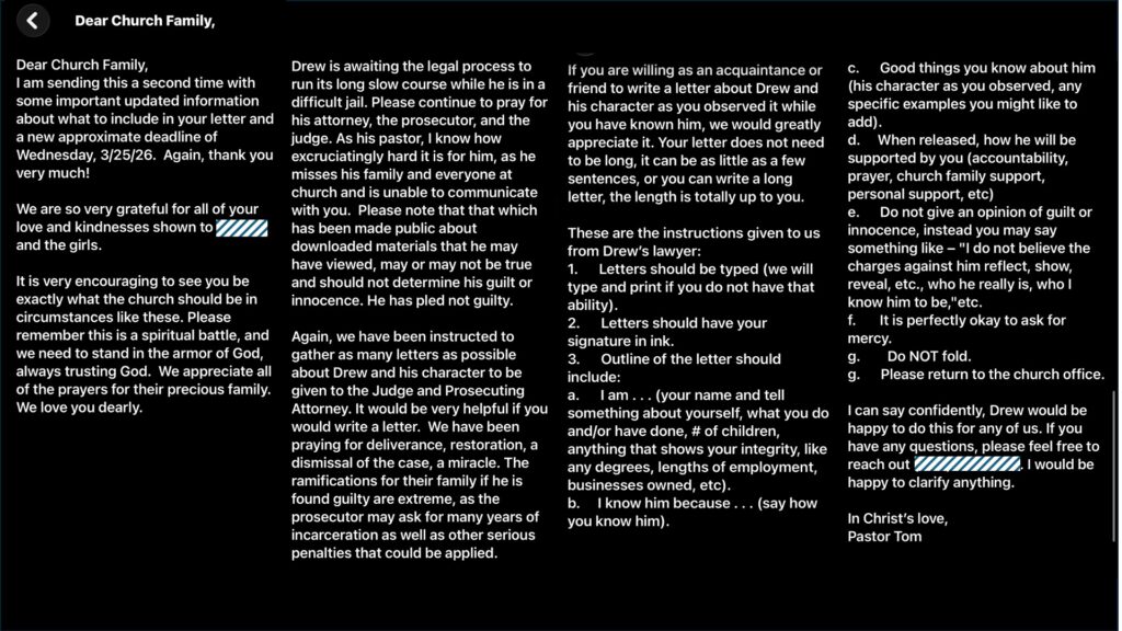 A Southern Baptist pastor has asked his congregation to write letters supporting his son-in-law, vouching for the man’s integrity and character following his arrest for possessing child sexual abuse material, according to an article in The Roys Report.
