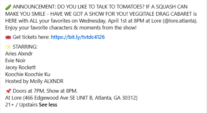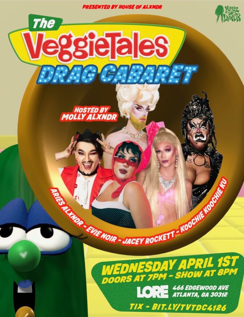 On April 1st, Lore Atlanta, a recently opened queer bar and nightclub venue that regularly hosts drag performances, put on a “VeggieTales Drag Cabaret.”