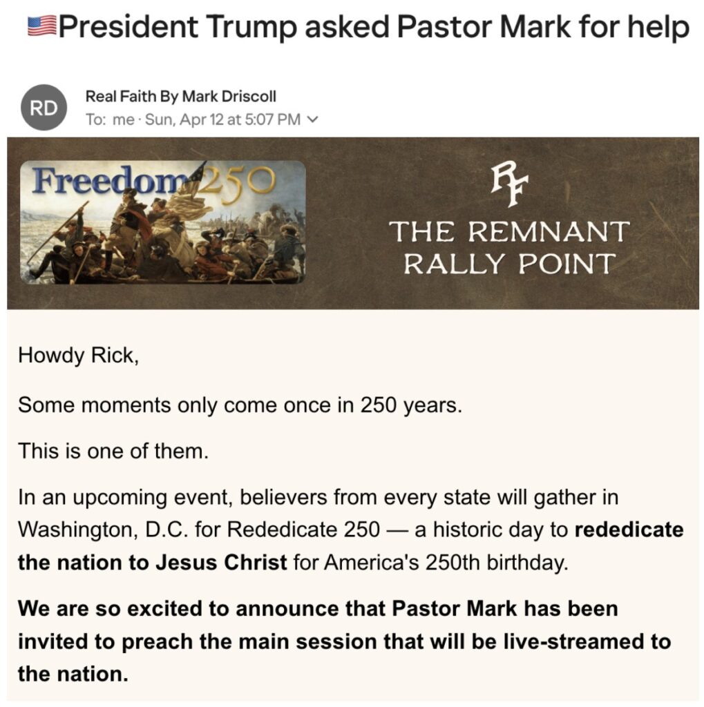 Pastor Mark Driscoll of Trinity Church is slated to preach during the main session of the upcoming Rededicate 250 celebration, according to a recent newsletter sent out by his Real Faith ministry.